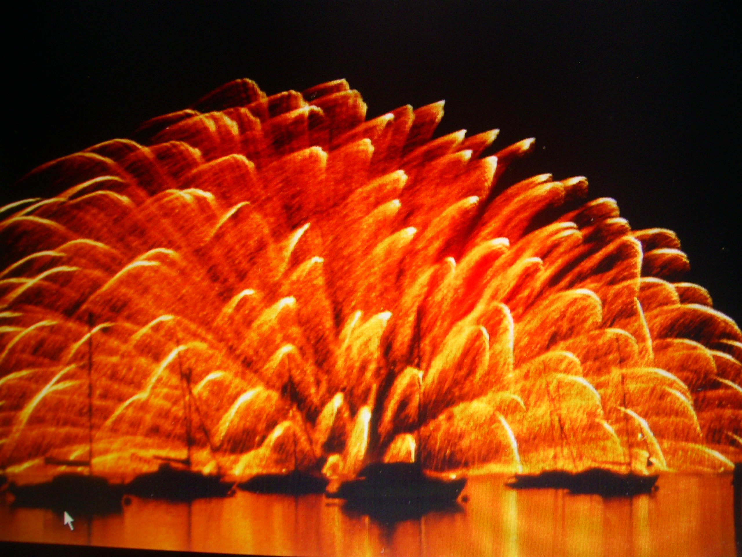- Der Ort des Geschehens wird in ein glutrotes Lichtermeer verwandelt. Die Eröffnung des Feuerwerkes wird durch Silberblitze eingeleitet. Die ersten Kometen und Krossetten steigen auf in Form von Weiden und Palmen, anfänglich bis zu 40 Meter Höhe, danach bis zu 60 Meter Höhe. Der Abschluß und das Finale wird durch Themenbilder (auf Wunsch!) wie z.B.Namen, zwei ineinanderverschlungenen Ringe, Herzen usw. gestaltet.